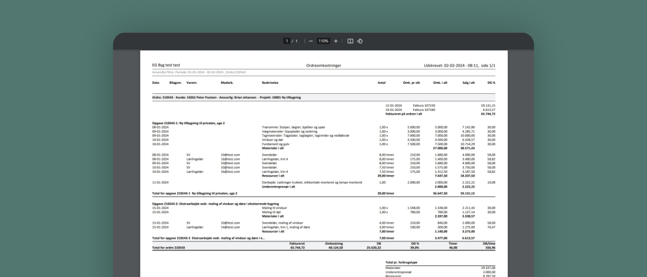 Vi er i fuld gang med at udvide vores projektrapporter. Vi forbedrer filtrering, vi tilføjer kolonner til yderligere data, og vi giver PDF'erne en overhaling, så de bliver nemmere at gennemskue. Vi forbedrer én projektrapport ad gangen og allerede ved næste opdatering er rapporten for omkostningsposteringer forbedret.