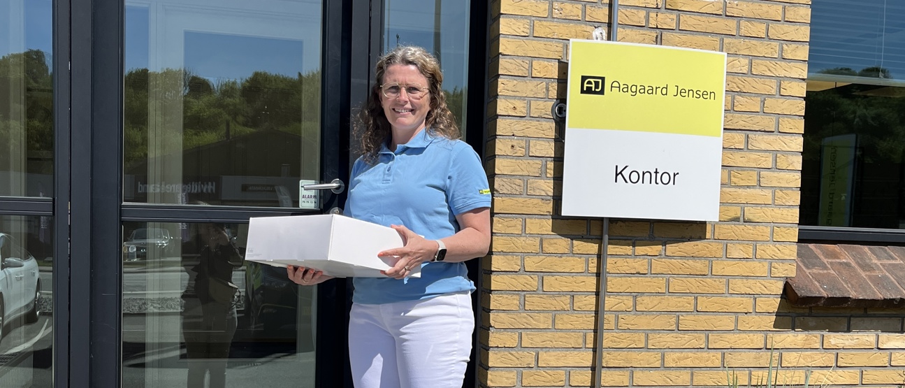Vinderen af konkurrencen blev udtrukket i sidste uge, og lykken pegede på Charlotte fra entreprenørvirksomheden Aagaard Jensen A/S i Vejle. "Jeg vinder ellers aldrig noget," sagde Charlotte med et smil, da hun fik leveret den store lagkage en solbeskinnet mandag eftermiddag.