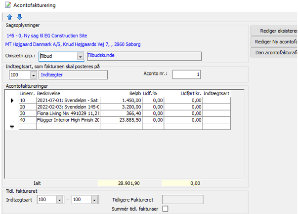 Ordretotal-linier overføres til Acontofaktura på sagen