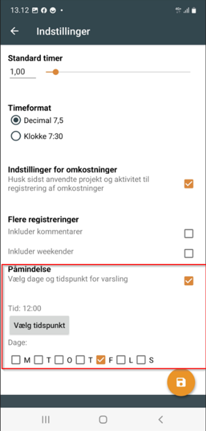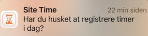 Under indstillinger i Site Time App kan medarbejderen vælge at oprette en påmindelse om, at de skal registrere timer. Der kan vælges tidspunkt og dage for varsling.
