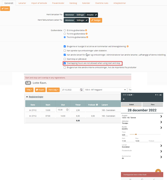 Når der er sat flueben i ny tjekboks "Overlappende timer er ikke tilladt ved brug af start og stop", er det ikke muligt at lave flere registreringer i samme tidsrum. Ny tjekboks findes under Virksomhed, Time og Indstillinger.