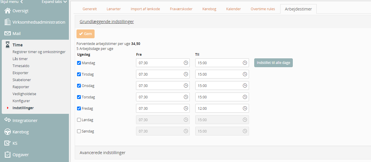 Generel opsætning finder du under Virksomhed, Time og Indstillinger. Husk at gemme opsætningen.