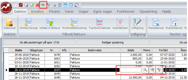 Det er muligt at søge i posteringer ved brug af Kikkert eller Ctrl + F