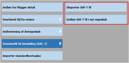 Gå i Funktioner -> Finansfunktioner og Standardfil til datadeling for at udlæse en SAF-T fil. Før denne funktion er mulig, skal du have opsat de Offentlig standardkontonumre i regnskabets kontoplan. Dette gøres under Finans -> Kontoplan.