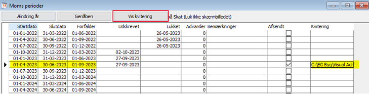 Når momsangivelsen er sendt til SKAT og underskrevet med NemId, vil man modtage en kvittering fra SKAT. Kvitteringen vil blive gemt i Momsperioder ud for den specifikke momsperiode. Kvittering kan ses ved tryk på Vis Kvittering