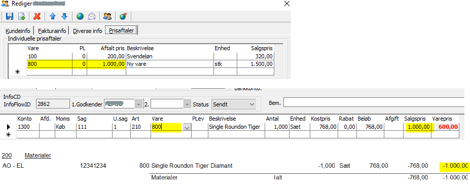 Hvis der findes en prisaftale på en kunde og kunden er tilknyttet en sag, bliver salgsprisen fra prisaftalen sat som salgspris i købsfakturaen. Når købsfakturaen bogføres bliver salgsprisen korrekt på sagen.