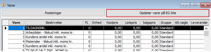 Det er muligt at sende opdaterede varer over i EG Site. Opdateringen kan tage lang tid alt efter antal varer. Gå i vareoversigten og tryk på knappen "Opdater varer på EG Site"