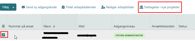 Sæt flueben til venstre for medarbejder og tryk på "Flere valg" og vælg Deltagelse i nye projekter
