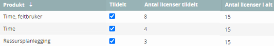 Antal licenser tildelt viser, hvor mange licenser der er brugt.