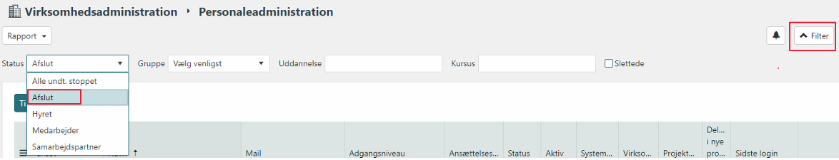Hvis medarbejderen er en tidligere ansat, vil denne sandsynligvis stå som afsluttet. Tryk på filter og vælg Afslut. Står medarbejderen på listen, sættes status til "blank"