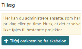 Skal medarbejderen have et fast tillæg hver gang der registreres timer, kan det opsættes ved at trykke på Tilføj omkostning fra skabelon - det kan evt. være km-penge eller diæter
