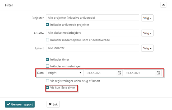 Vælg om rapporten skal vise kun låste eller alle timer