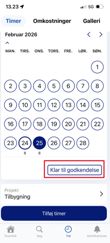 Ved at trykke på pilen ned i kalenderen får du mulighed for at sætte timer og omkostninger som klar til godkendelse.