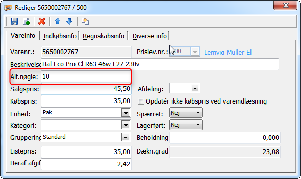 Ved indlæsning opdateres varernes Alt. nøgle i varekartoteket:
