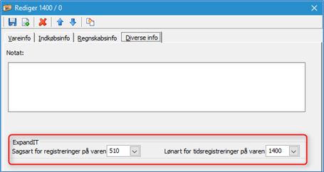 VIGTIGT: På fanen "Diverse info" vælges Sagsart samt Lønart. Det er disse 2 felter der bestemmer hvordan tidsregistreringen fra ExpandIT indlæses til sagerne. Lønarten er den du lige har oprettet:
