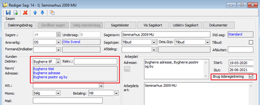 Alle sager skal være påført et kundenummer og der skal sættes et flueben i brug tidsregistrering.