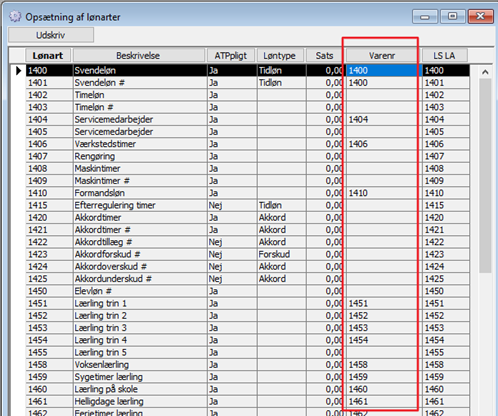 - Lønarter – kun de lønarter, der har et varenr. påført