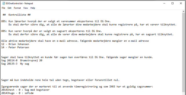 Når alle opsætninger er lavet, kan kontrollisten vise evt. fejl