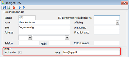 Godkendere i InfoFlow skal være oprettet som medarbejdere. På disse medarbejdere markeres at de er godkendere, samt indtast deres e-mail adresse som benyttes til advisering af nye fakturer til godkendelse: