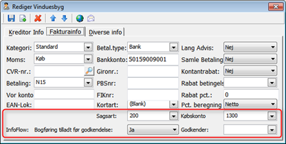 Her kan vælges en fast godkender i InfoFlow af fakturaer fra kreditoren f.eks. forsikringer, vægtafgift m.v. Når der sættes en godkender på her, overstyrer den også den sagsansvarlige på sagen som godkender.