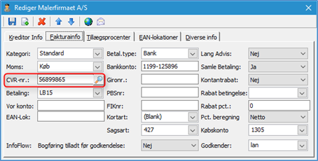De kreditorer man modtager OIO fakturaer fra, skal påføres CVR-nummer under fanen"Fakturainfo":