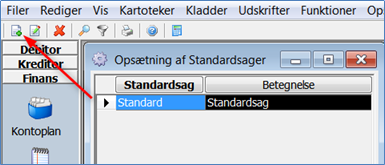 Vælg Opsætning -> Sag opsætninger -> Standard sager (klassisk menu: Opsætning –> Sagsstyring –> Standardsager). Med oversigten fremme over standardsager, kan du åbne en eksisterende standardsag, eller du kan oprette en ny, ved at vælge Nyt kartotekskort i værktøjslinjen eller benyt genvejstasten <Ctrl+I>.