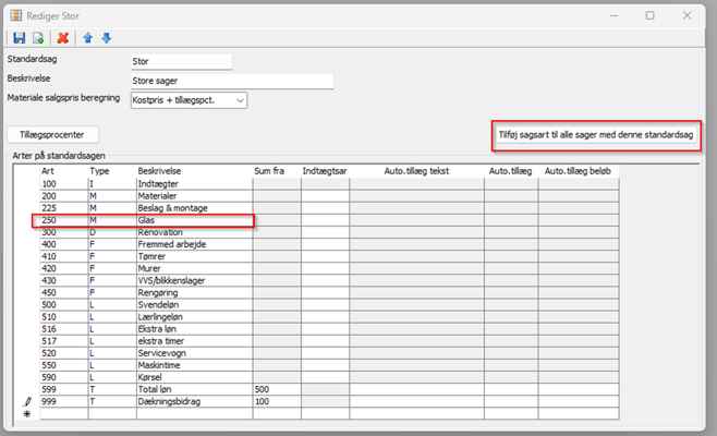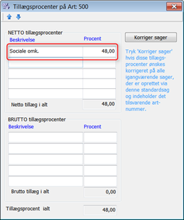 På alle arter med typen L (lønninger) indtastes en Netto tillægsprocent, for tillæg til sociale omkostninger. Denne sats tillægges kostprisen, så lønomkostningen på sagen er indeholdt dette tillæg.