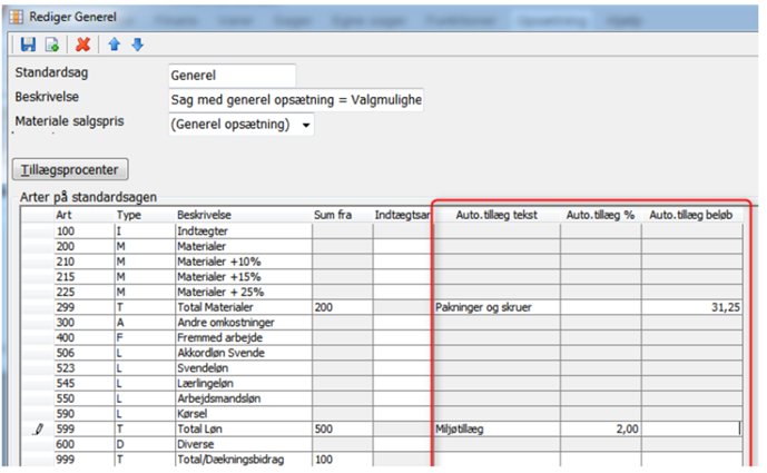 Tillæggene oprettes på total-arter. Tillægget beregnes som en procentsats af art-totalen, hvis der indtastet en procentsats i Auto.tillæg eller som et fast beløb, hvis der indtastes et beløb i Auto.tillæg beløb. Der kan også indtastes i begge felter, hvorved tillægget beregnes som et fast grundbeløb plus en procentsats.