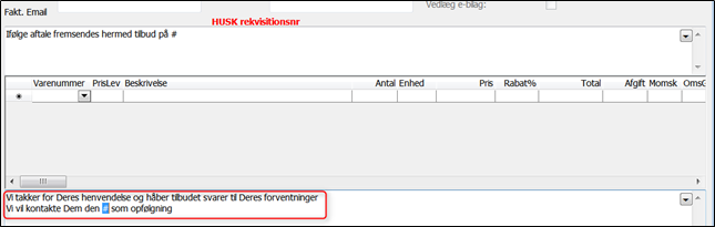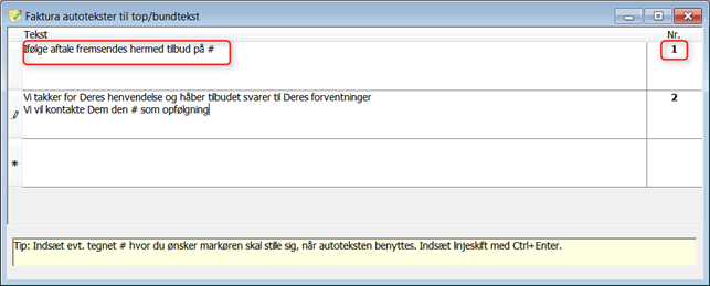 Når Autoteksten er hentet ind på tilbuddet, kan det efterfølgende redigeres. Bemærk at markøren i nedenstående eks. har placeret sig på tegnet #. I dette eksempel skal f.eks. indtastes dato for kontakt til kunden: