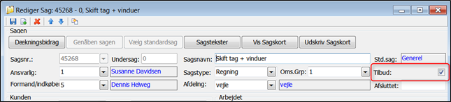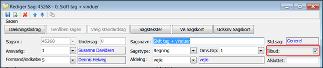 Når sagen er oprettet med relevante oplysninger, samt der er valgt standard sag, markeres sagen med flueben i feltet "Tilbud".