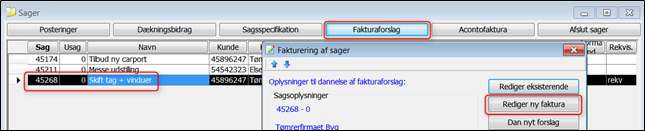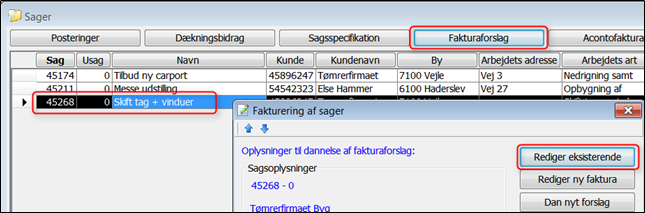 Stå på sagen og vælg i menuen foroven "Fakturaforslag". Herefter skal du vælge "Rediger eksisterende":