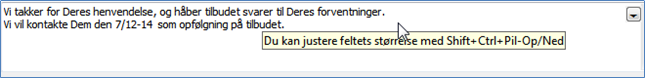 Hvis top- og bundtekst felterne ønskes udvidet på skærmen, kan dette gøres ved at klikke ind i feltet og derefter trykke på genvejstasten <Shift+Ctrl+pil op/ned>. Den aktuelle indstilling huskes pr. bruger.