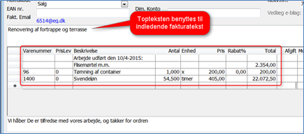 Top- og bundtekster anvendes til indledende/afsluttende tekster til fakturaen. Hvis du under menuen Debitor -> Top/bund tekster (klassisk menu: Opsætning -> Diverse -> Faktura top/bundtekst) har indtastet en generel tekst, f.eks. "Bemærk, vi har fået nyt bankkontonummer", vil denne automatisk blive foreslået på alle fakturaer, men kan frit ændres eller slettes på den enkelte faktura. Hvis ønsket kan højden på top- og bundfelterne justeres, ved at klikke ind i feltet og trykke på <Shift+Ctrl+pil op / pil ned>. Den valgte indstilling huskes på den aktuelle bruger.