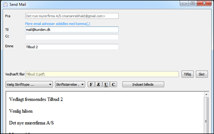 4. Klik her for afsendelse af tilbuddet via mail. Når man vælger knappen, kommer skærmbillede frem for afsendelse af mail. Kræver at modulet PDF fakturering er sat korrekt på. Se minivejledningerne O04 - Opsætning PDF fakturering samt O05 - Valg af PDF baggrund til fakturaer for opsætning af dette. Se yderligere information om afsendelse af udskrifter via mail i minivejledningen D03 - Send faktura m.m. via mail.