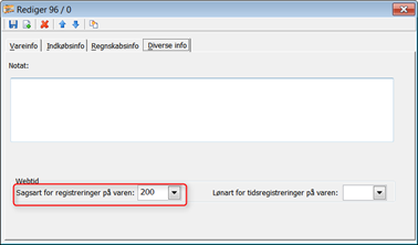 På fanebladet "Diverse info" udfyldes ønsket Sagsart. Det er dette felt der bestemmer hvordan materialeforbruget fra Webtid indlæses til sagerne. Kig evt. på en af dine eksisterende varer du bruger i Webtid: