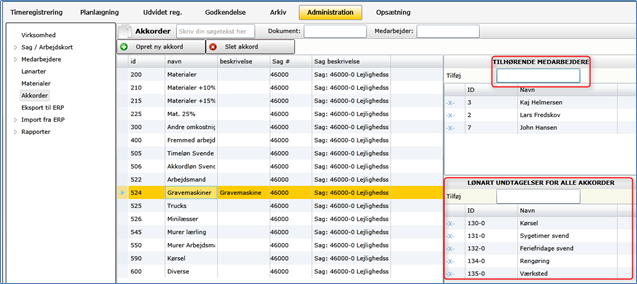 Vedligeholdelse af arter (akkorder) foregår under Administration –> Akkorder. Det er også under dette menupunkt, man skal tilføje medarbejdere til den enkelte art: