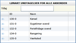Nederst til højre vælges evt.lønarter, hvor medarbejderen aldrig må kunne vælge en specfik art. Disse valg foretages kun én gang, og vil være gældende på alle akkorder.