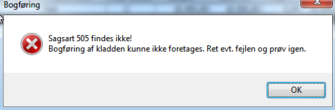 Hvis du har indlæst Webtid registreringer i en sagskladde, og du ikke har fået valgt standardsag på en sag der er registreret timer til, vil du få en fejl ved bogføring af kladden. Fejlmeldingen vil ligne nedenstående: