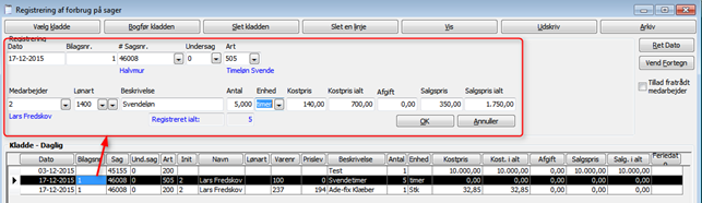 Start med at indtaste linjen korrekt i kladden med sagsnr, art, medarbejder, lønart samt antal. Kig på den indlæste linje, og sikre dig at linjerne matcher alle oplysninger: