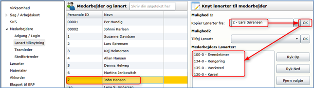 Stil dig på den nye medarbejder og vælg aktuelle lønarter i højre side. Vær opmærksom på at du med fordel kan kopiere lønarter fra en eksisterende medarbejder, der har samme rolle i virksomheden: