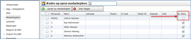 Vælg i menuen: Administration -> Medarbejdere. Ud for den aktuelle medarbejder markeres, at vedkommende ikke længere er aktiv. OBS – får du behov for at se noget historik på medarbejderen, må du midlertidigt sætte flueben i aktiv igen – og huske at fjerne det når du har lavet din foresppørgsel