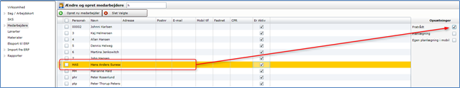 Vælg i menuen: Administration -> Medarbejdere . Marker den aktuelle medarbejder, og sæt flueben yderst til højre i feltet Fratrådt: