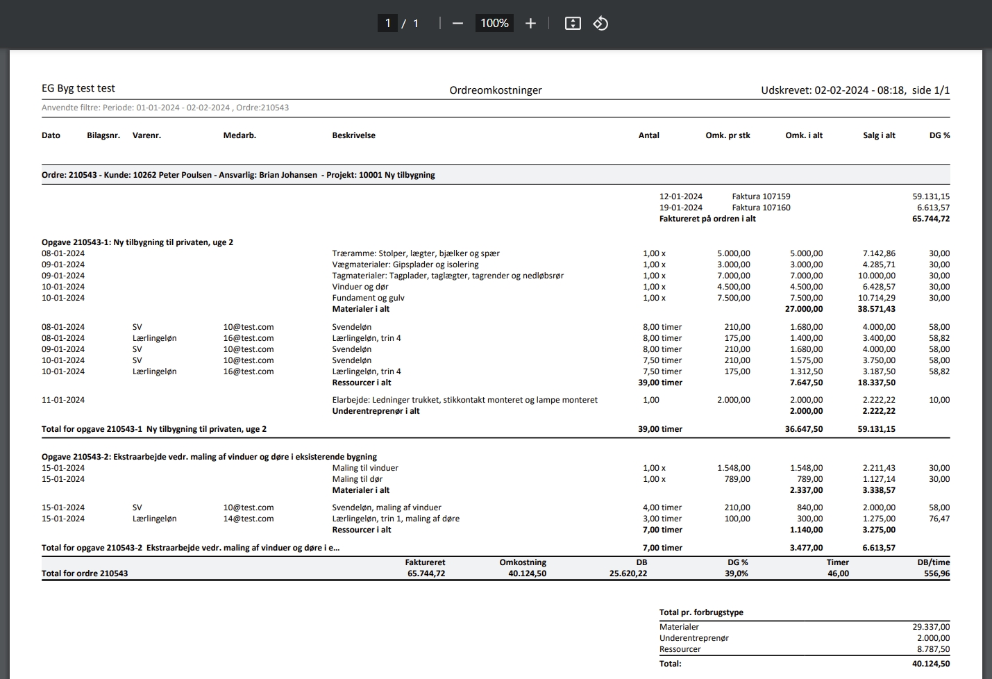 - Total antal timer og total salgspris pr. opgave samt pr. ordre udskrives nu også. Tidligere blev totalerne for timer og salgspris kun udskrevet i bunden sammen med de øvrige totaler for hele ordren