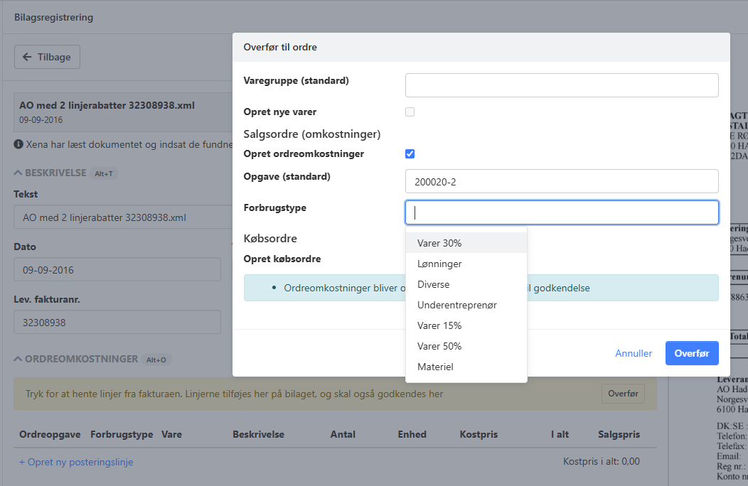 Efter denne opdatering er funktionaliteten også tilgængelig i funktionen Overfør, som benyttes på elektroniske købsfakturaer. I samme ombæring har vi byttet rundt på de 2 felter Forbrugstype og Ordreopgave, så du fremover vælger Ordreopgave først, og dernæst forbrugstype.