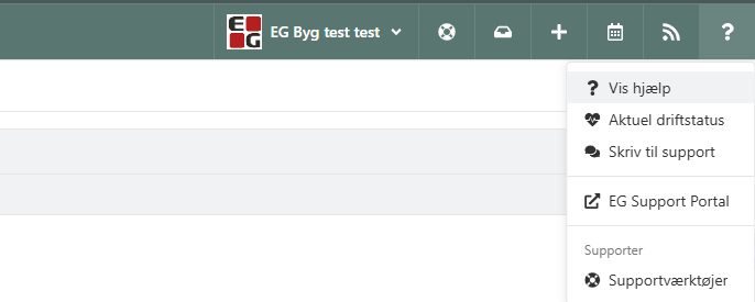 Der er nu tilføjet en genvej i hjælpemenuen i Xena, så du kan åbne EG Support Portal direkte. Når du er i kontakt med supportteamet og de skal have adgang til din skærm, klikker du blot på spørgsmålstegnet øverst til højre i Xena og vælger menupunktet EG Support Portal.