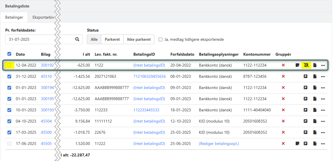 Det er ikke længere muligt at vælge parkerede fakturaer i betalingslisten og dermed heller ikke muligt at eksportere betaling af dem til banken. Hvis du ønsker at fjerne parkeringen på en faktura, kan du følge guiden: ➡️ Parkering og noter.