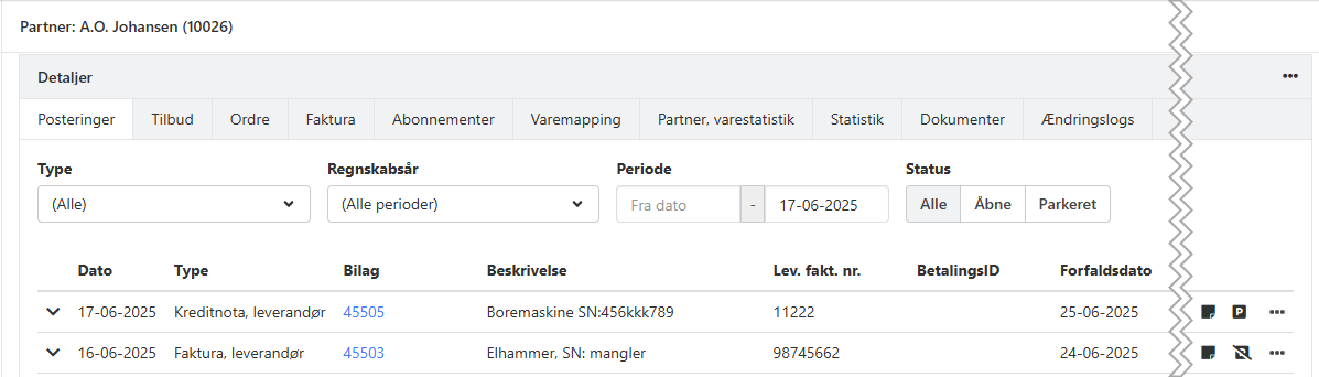 I oversigten over partnerposteringer på partneren er kolonnebredden optimeret, så du kan se mest mulig tekst i kolonnen Beskrivelse. Har du brug for at ændre en beskrivelse eller se flere detaljer, kan du åbne bilaget direkte ved at klikke på bilagsnummeret.