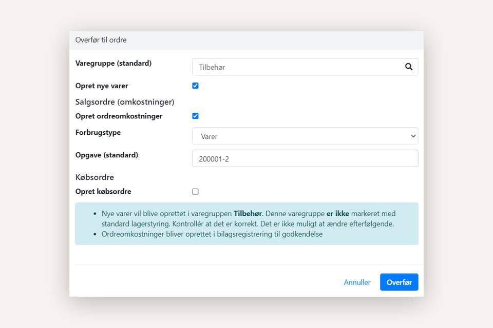 Vigtigt: De nyoprettede varer vil ikke have en foruddefineret kost- eller salgspris. Disse skal tilføjes manuelt efterfølgende.