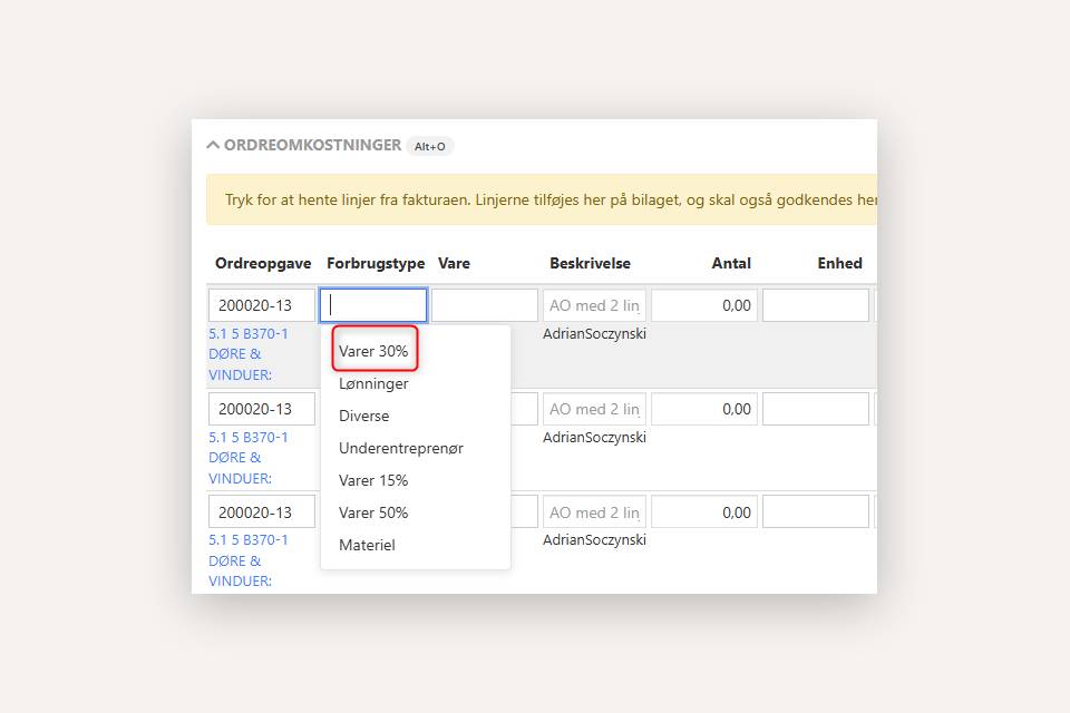 I bilagsregistrering vil de forbrugstyper, der er tilknyttet den valgte ordre under fanen Fakturering, blive listet øverst. I det følgende eksempel har jeg valgt forbrugstypen Varer 30% på den tilknyttede ordre, og derfor står denne forbrugstype øverst i listen.