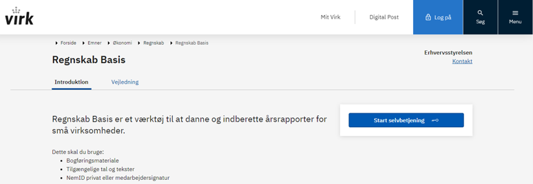 EG Visual åbner websiden til Virk.dk og du kan nu indberette Årsregnskabet ved at trykke på Start selvbetjening.